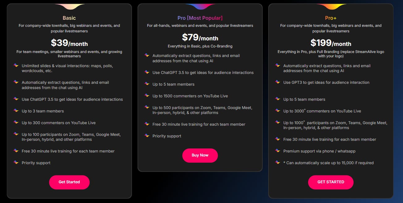 We used to have a ‘pay per event’ option, but we found it complicated our pricing too much. Also, many users wanted to test out StreamAlive several times before their event.