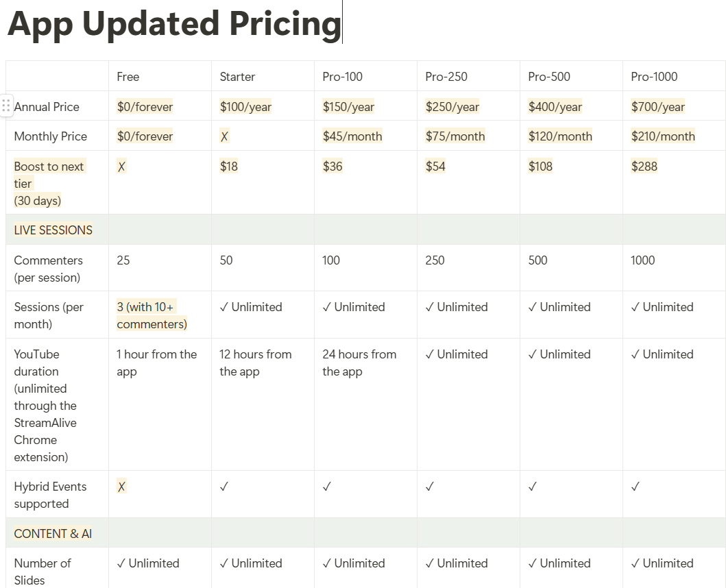 We decided that keeping a monthly plan with the option to boost for the Pro tier would be better for those with an occasional event (like quarterly town halls), because they can test out StreamAlive without restrictions before their event.
