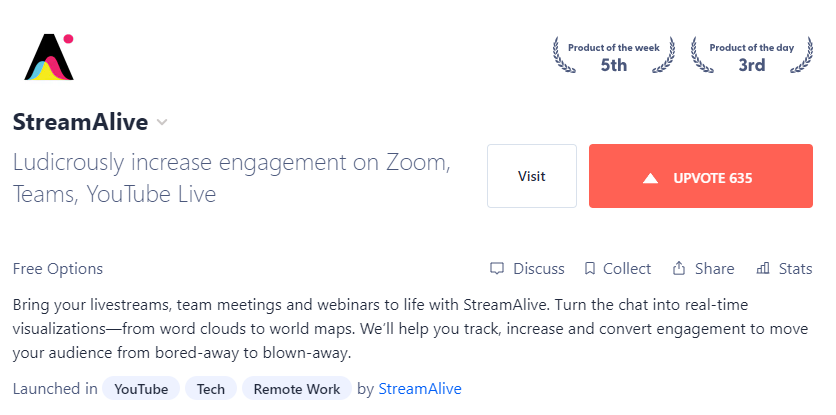 Last time we did a ProductHunt launch for the main StreamAlive app we were the #3 product of the day and #5 product of the week.