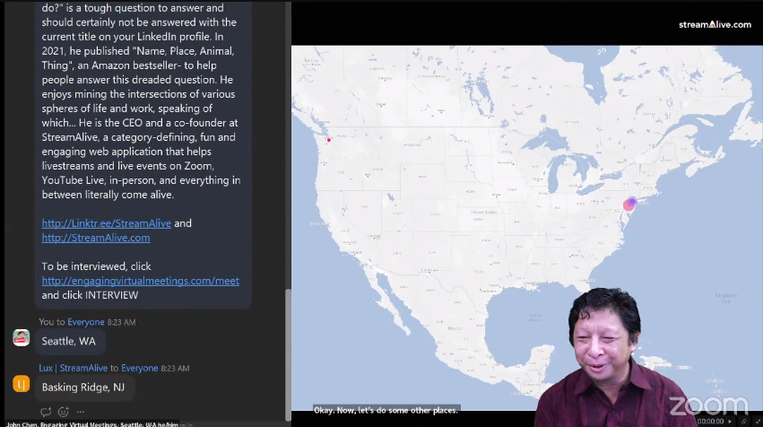 This week John Chen from Engaging Virtual Meetings invited me to talk about my book (Name, Place, Animal, Thing), why answering the question “what do you do?” is so difficult, and how we came up with the idea for StreamAlive.