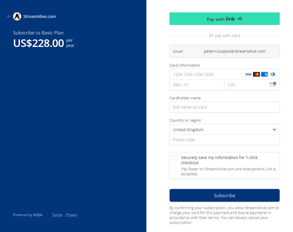 That’s when we discovered there was no coupon field on the Stripe payment form.