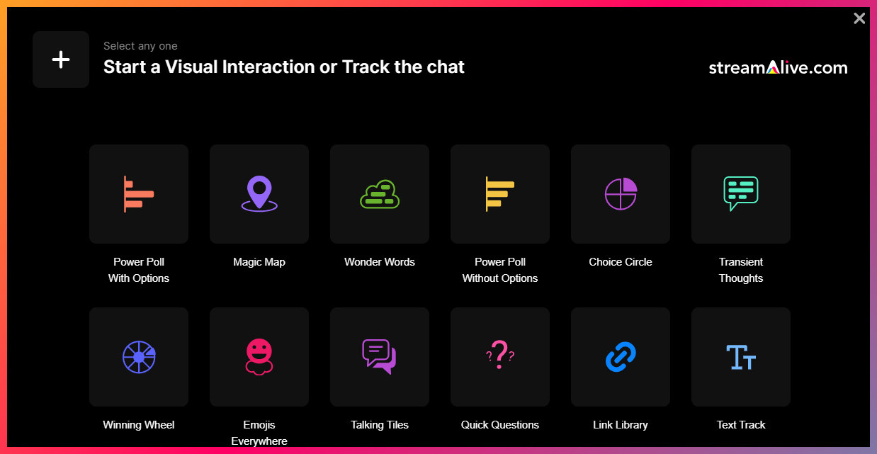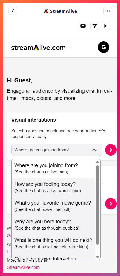 Additionally, if you’re not yet a StreamAlive user, you can still run polls, word clouds, spinner wheels, interactive maps, etc. as a guest - you don’t even need a StreamAlive account.