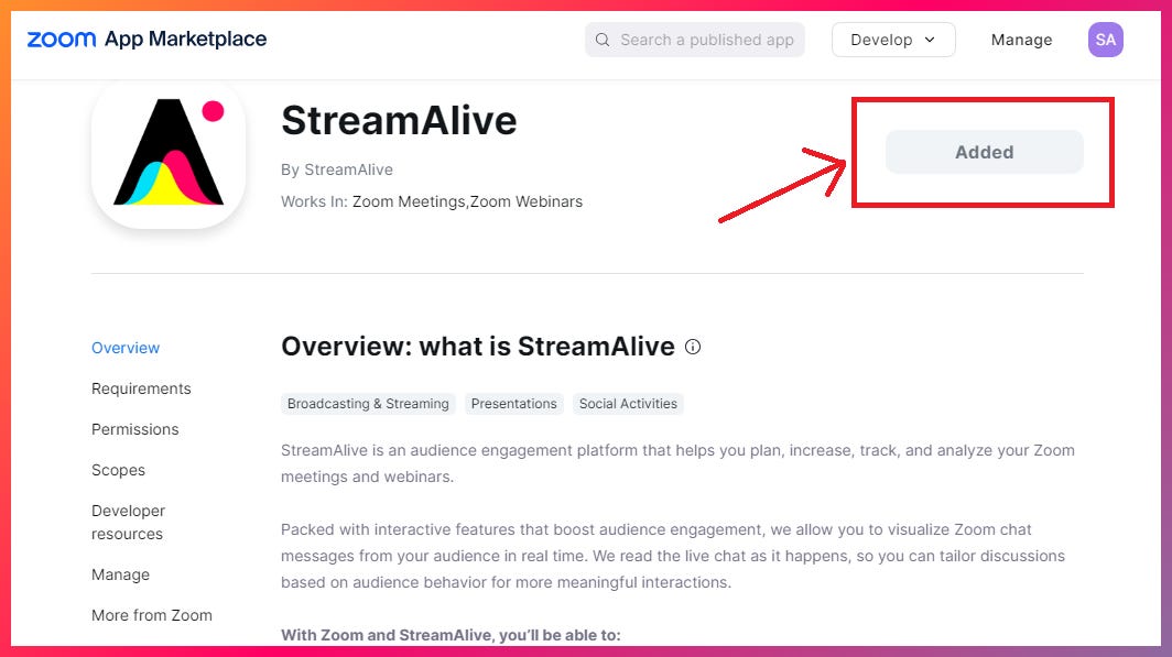 By adding the StreamAlive App for Zoom (yes, it’s a mouthful) you don’t need to login to the StreamAlive website to set up your interactions.