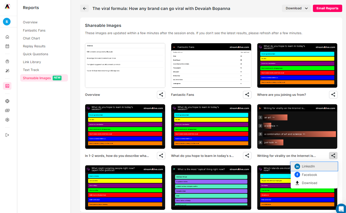 Weāve just added a super-easy way for you to share your post-event polls, word clouds, and other audience interactions that you created using StreamAlive.