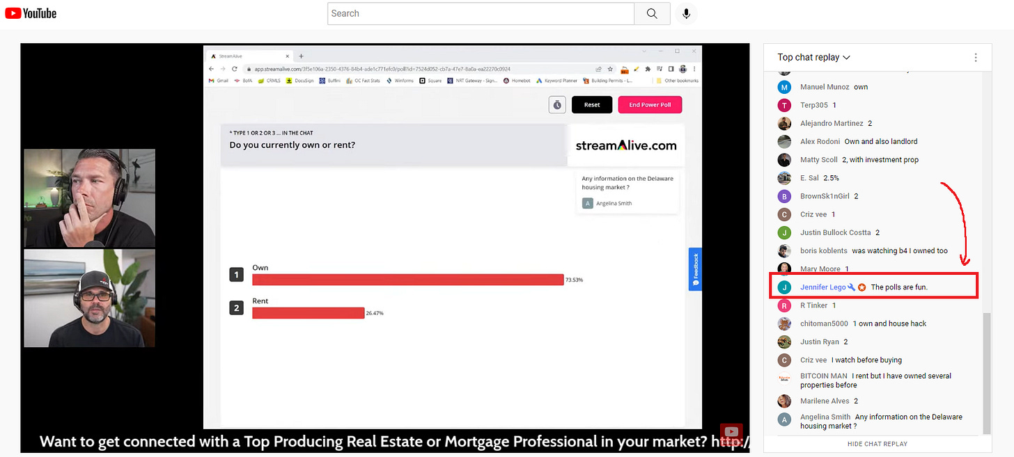 Jeb is a real estate investing coach with a loyal following. His livestreams attract thousands of viewers. He recently used StreamAlive and was surprised to learn that most of his viewers were homeowners after he asked a question using Power Polls.
