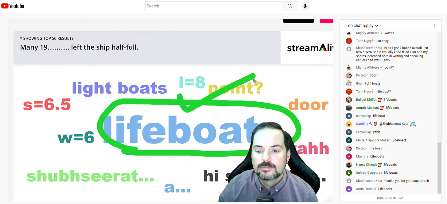 Adrian is an online English tutor with almost 2 million subscribers and does regular livestreams for students around the world. Adrian likes to project his computer screen behind him and annotate directly on the screen. In this broadcast, he used Wonder Words to encourage his audience to type their answers in the chat.