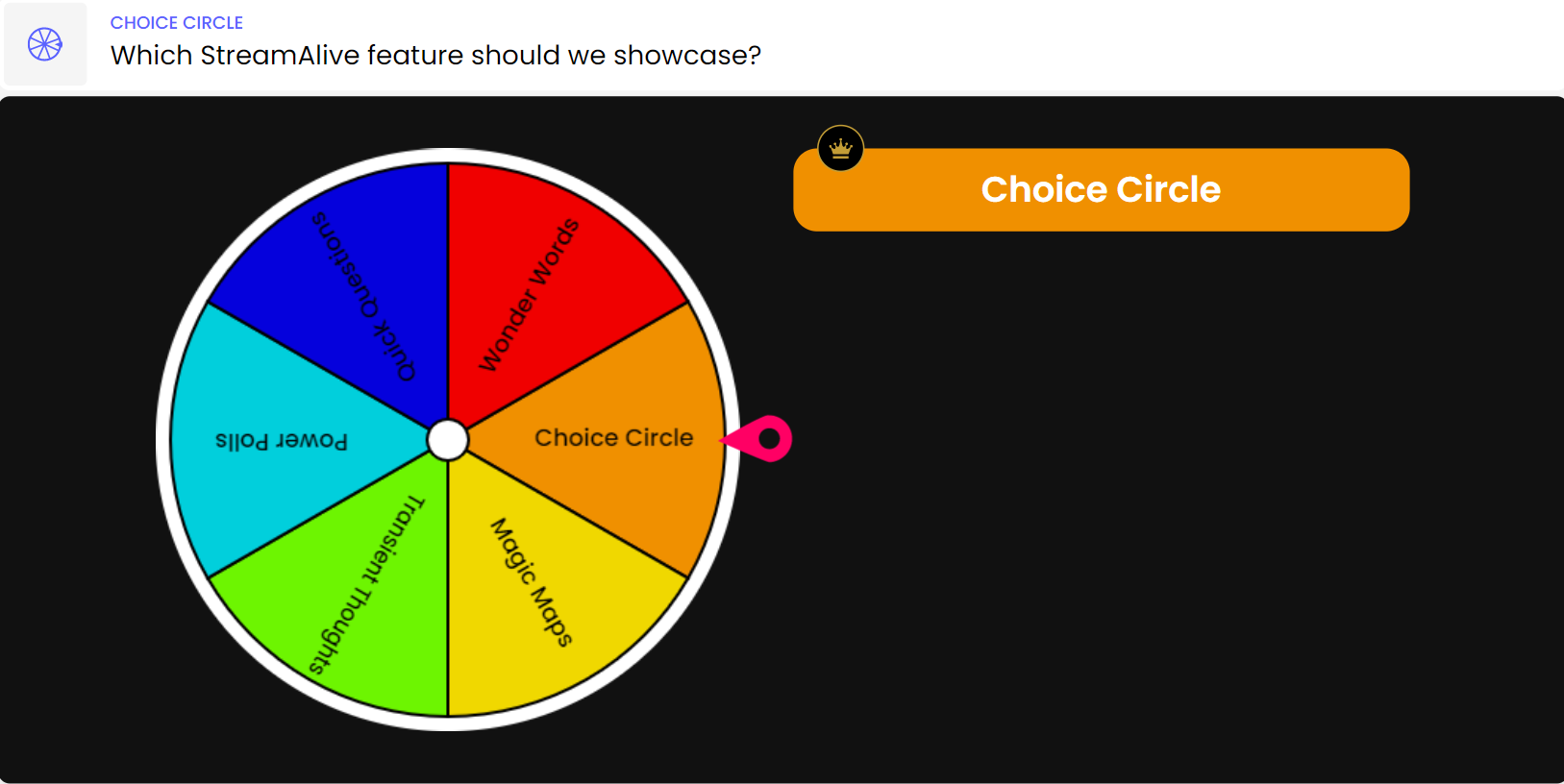 So what can Choice Circles do for you? Spin our wheel to decide which one of your pre-specified options will be chosen. Use this feature for anything where you may need to make a choice, pick an opinion or team, or simply want to add a burst of confetti to your interaction.