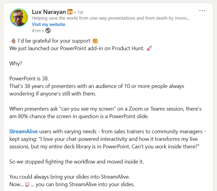 Lux talks more about why we built the StreamAlive app for PowerPoint over on LinkedIn.