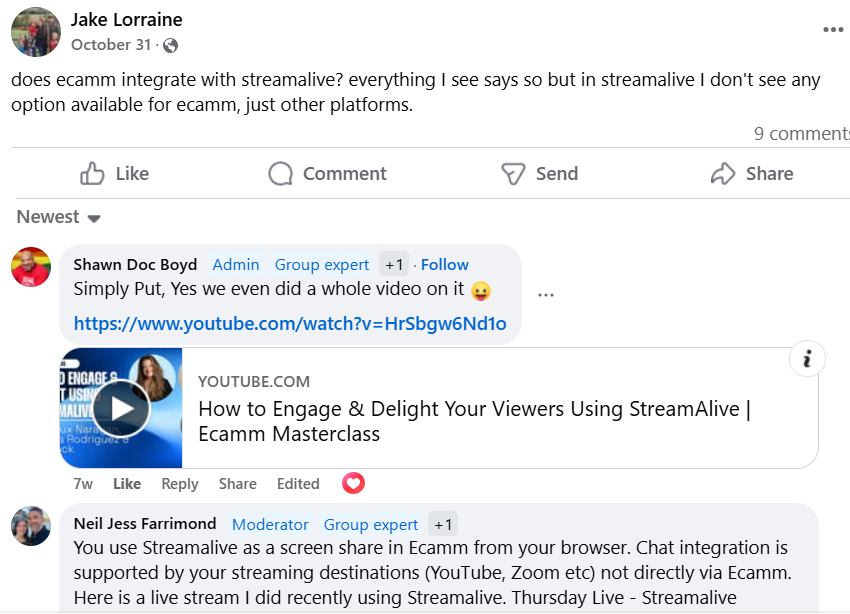 And when we saw lots of people asking about StreamAlive in the Ecamm community, it made it a no brainer to start our community on Facebook.