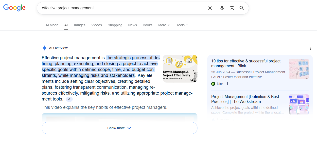 Then there’s Google’s AI overviews in the search results. Stealing clicks from companies like Monday.com and Hubspot.com which built their brands on the back of answering top of funnel questions like “effective project management”